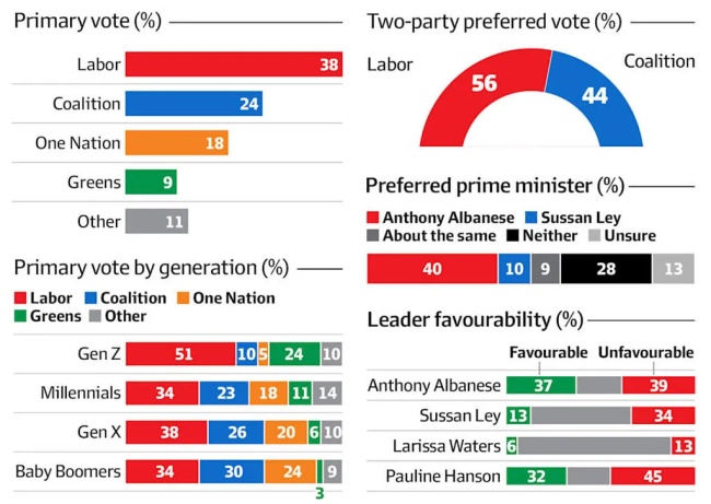 对自由党领导人Sussan Ley作为偏好的总理人选的支持率降到了10%,总理Anthony Albanese为40%。对Ley的净好感度为负21%——13%好感,34%反感;总理的净好感度为负2%。
