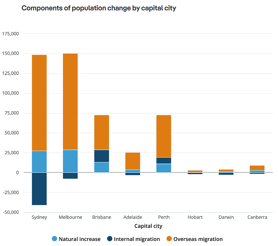 根据澳洲统计局的数据,过去一年中大多数海外移民定居在各大首府城市。