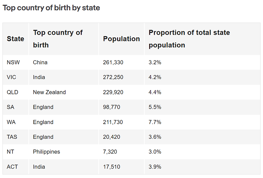 西澳海外出生人口比例最高(34.1%),其次是维州(31.7%)和新州(31%)。