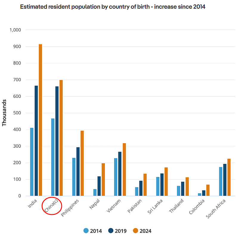 此外,越南(约26.8万人)、南非(约19.5万人)、尼泊尔(约11.9万人)、马来西亚(约17.8万人)和斯里兰卡(约13.7万人)也在澳洲海外出生人口来源国前十之列。