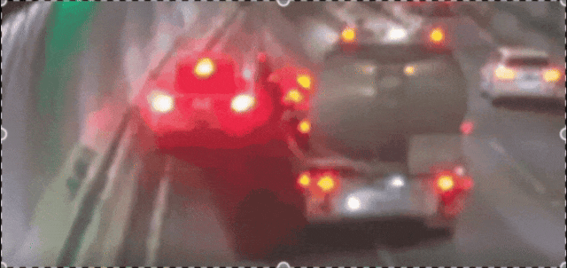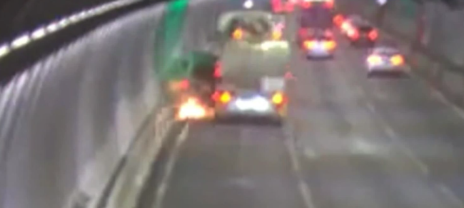 根据隧道监控画面显示,晚上约9点15分,一辆运油卡车在出城方向的车道变线时,似乎没有察觉前方有一辆三菱Pajero越野车。油罐车向左打灯并驶入相邻车道,瞬间将Pajero夹在卡车与隧道墙之间。火花与碎片在瞬间飞溅,场面令人心惊。