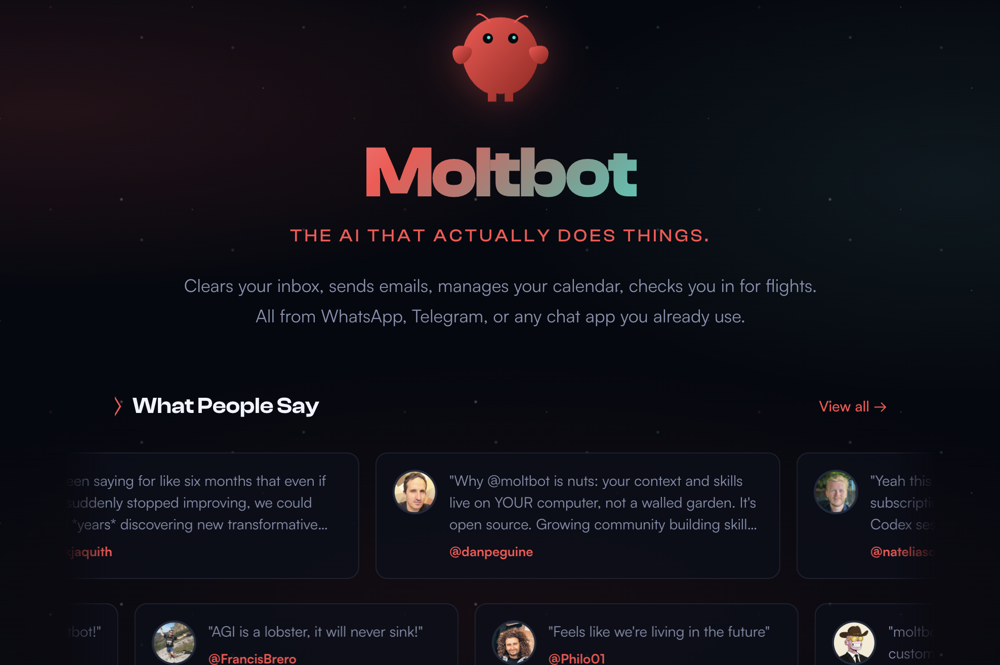 这个带着龙虾 Logo 的 Clawdbot 有何特别?官网的介绍显示,这是一个“有灵魂”的AI助手,可以帮用户清空收件箱、发送电子邮件、管理日历、办理航班值机等等,并且可以接入用户常用的任何聊天APP,所有的操作均可通过 WhatsApp、Telegram等平台完成,用户只需通过对话,就能操控设备自动执行各类任务。