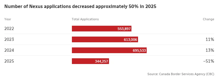 但边境局表示,2025年收到的申请量仅不到35万份,较前一年近乎腰斩——2024年有近70万名旅行者递交了Nexus卡申请。