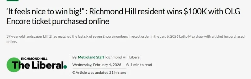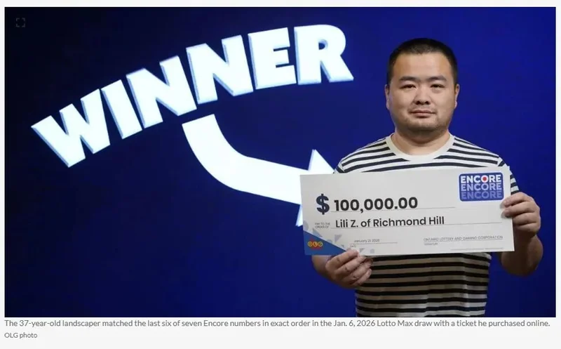这位37岁的景观美化师(Landscaper)在2026年1月6日的乐透MAX(Lotto Max) 开奖中,凭借一张在线购买的彩票,精准匹配了“再来一次”(Encore) 附加游戏中7个号码的最后6位,且顺序完全一致。