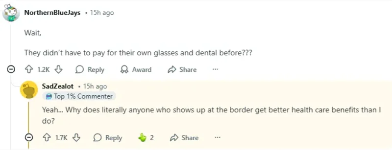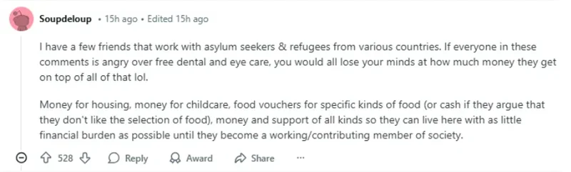“我有一些朋友在帮助来自不同国家的寻求庇护者和难民。如果这些评论里的人都对免费的牙科和眼科保健感到愤怒,那你们要是知道他们除了这些福利之外还能拿到多少钱,肯定会更加震惊,哈哈。