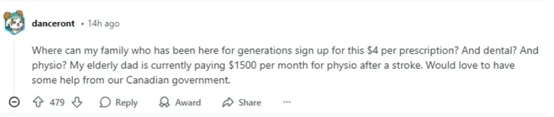 “我的家人世世代代都住在这里,请问去哪里可以申请每张处方4加元的补贴?牙科和理疗呢?我年迈的父亲中风后,目前每月理疗费用高达1500加元。我们非常希望得到加拿大政府的帮助。”