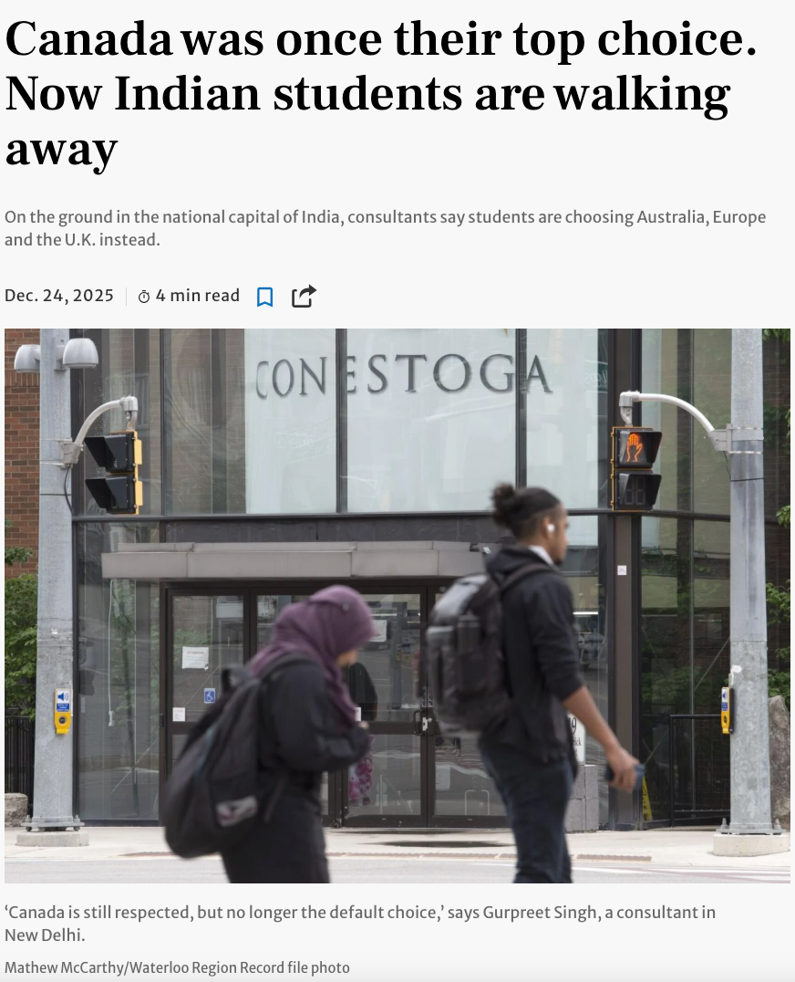 印度首都新德里的一名咨询顾问表示,加拿大曾是印度学生他们的首选。如今,却纷纷放弃,学生们转而选择澳大利亚、欧洲和英国。