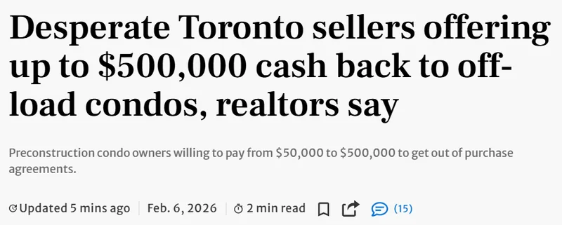 随着大多伦多地区房地产市场持续走弱,一些陷入困境的期房公寓买家甚至愿意倒贴现金,只求有人接手他们的房源。