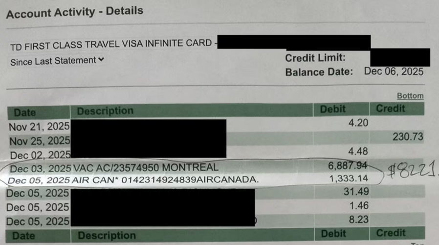 Virani还控诉,旅行社未经他们同意,擅自用他伴侣的信用卡多扣了数千加元的“升舱费”。尽管他收到了一张1,188加元的支票,作为这笔不合理扣款的部分退款,但全款至今仍未退还,当初购买机票的本金也毫无音讯。