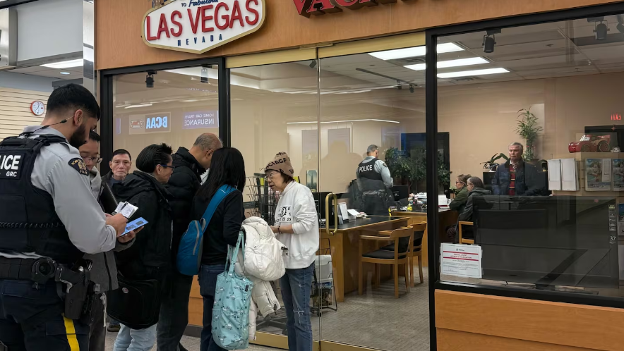CTV新闻记者抵达时,恰逢列治文皇家骑警的警员离开,旅行社门口已聚集了一小群人,其中不少人都是来要求退款的。