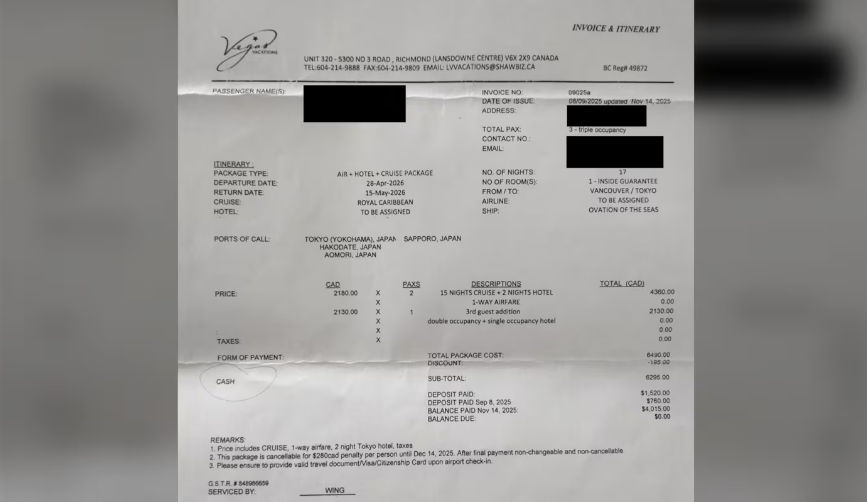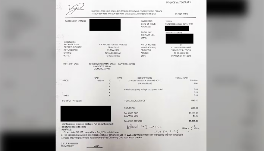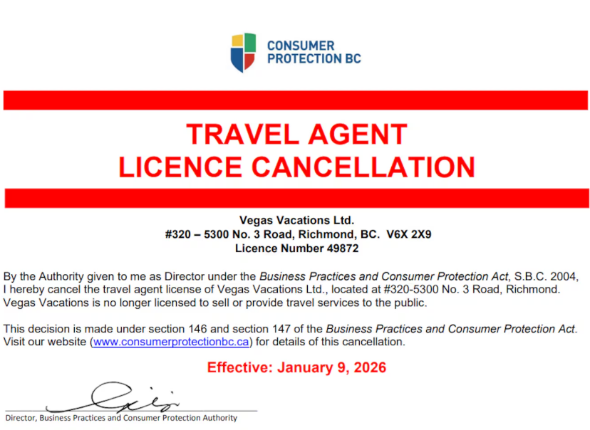 1月9日,不列颠哥伦比亚省消费者保护局在审查了该旅行社2024至2025年的财务报表后,正式吊销了Vegas Vacations的营业执照。