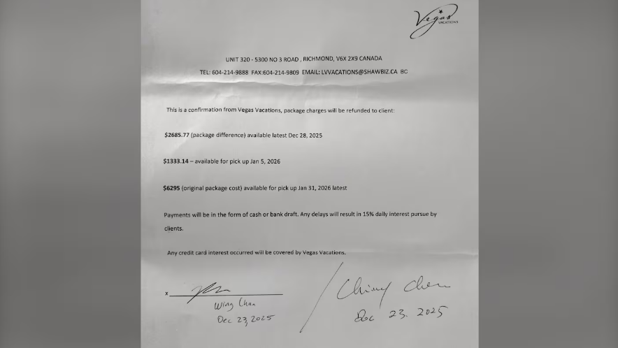 Leung认为,或许是自己报了警,Vegas Vacations才松口,表示会退还父母信用卡中那些来路不明、存在争议的扣款,并于2025年12月23日出具了一份书面协议。