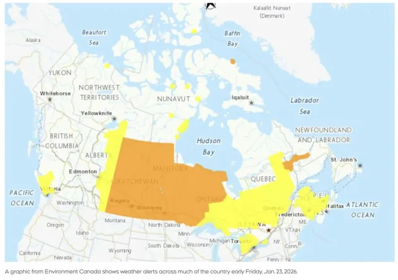 橙色警告(第二高级别):萨斯喀彻温省、曼尼托巴省全境及安省西北部大片区域,风寒体感 -40℃至-50℃