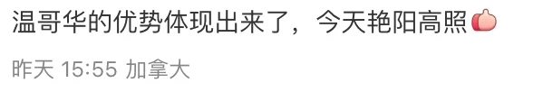 “温哥华的优势体现出来了,今天艳阳高照。”