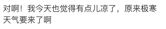 “对啊!我今天也觉得有点儿凉了,原来极寒天气要来了啊。”