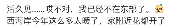 “活久见……哎不对,我已经不在东部了。西海岸今年这么多太暖了,家附近花都开了。”