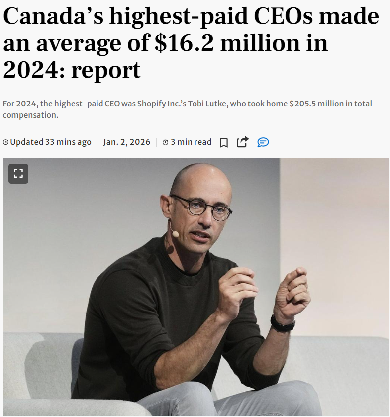 加拿大政策替代中心(CCPA)今天发布的报告显示,100位薪酬最高的首席执行官的平均年收入达到1620万加元,超过2022年的前纪录1490万加元。