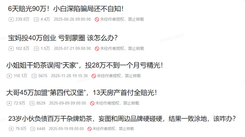 在勇哥的直播间,你可以看见因为《哪吒2》爆火花了28万加盟“哪吒仙饮”奶茶,结果不到一个月全部亏完的年轻女生[1];想开蜜雪冰城连官网都没找到,半路被快招公司截胡在小学门口开“中药奶茶”,每天营业额七十的宝妈[2];为了开杂牌奶茶店直接花一百万租下一栋六层碉楼,一二楼开奶茶,三四楼开棋牌室,顶楼做网红打卡点,每天赚得还不够付7个员工日薪的大哥[3]……