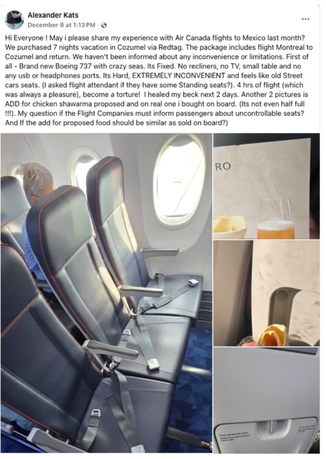 卡茨于周一在 “航空乘客权利” 脸书群组分享了自己的糟糕经历。他表示,自己通过旅游平台 Red Tag 购买了从蒙特利尔飞往墨西哥科苏梅尔的全包度假套餐,其中包含加拿大航空公司的往返航班。