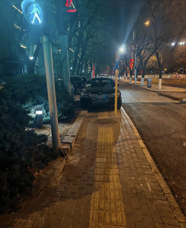 一辆贴着临牌的车违停在人行道上,影响行人通行。