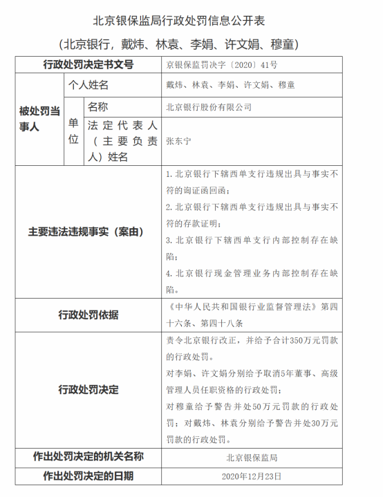 而在上述业务合作过程中,北京银行的违规行为被监管部门查处。2020年12月23日,北京银保监局已对北京银行及戴炜、林表、李娟、许文娟、穆童5名个人作出行政处罚。该处罚指向的违法事实为,北京银行下辖西单支行违规出具与事实不符的询证函回函、存款证明,且西单支行内部控制及北京银行现金管理业务内部控制均存在缺陷。据此,北京银保监局责令北京银行改正并罚款350万元,对李娟、许文娟分别取消5年董事、高级管理人员任职资格,对穆童警告并处50万元罚款,对戴炜、林表分别警告并处30万元罚款。