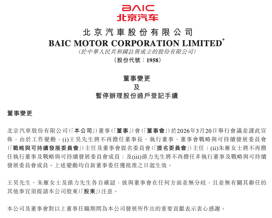据了解,张国富将前往北京汽车任董事长。3月20日,北京汽车发布公告,由于工作变动,王昊将不再担任董事长、执行董事、董事会战略与可持续发展委员会主任及董事会提名委员会主任。北京汽车董事会建议委任张国富为非执行董事,如股东会批准张国富任非执行董事,则进一步提议提名张国富任董事长。