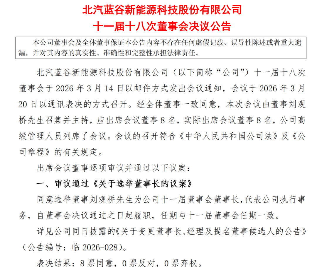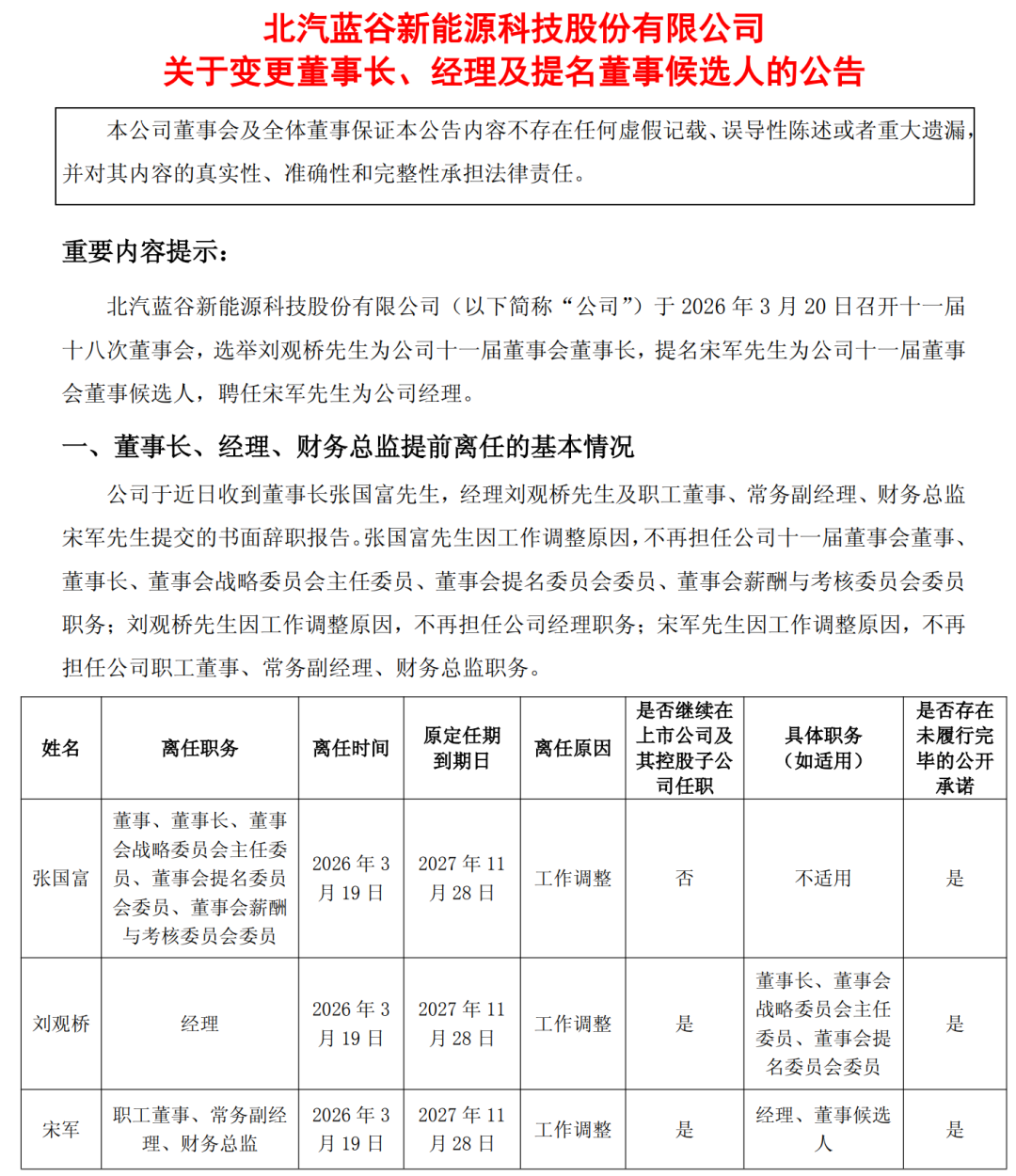 日前,北汽蓝谷新能源科技股份有限公司(下称“北汽蓝谷”)发布公告披露,近日收到多位高层的书面辞职报告。其中,张国富因工作调整原因申请辞去董事长、董事会战略委员会主任委员等职务,辞职后将不再担任公司任何职务;刘观桥因工作调整原因,不再担任经理职务,仍任公司董事;宋军不再担任公司职工董事、常务副经理、财务总监职务。当日,北汽蓝谷召开董事会,会议通过同意选举刘观桥为新一届董事会董事长,同意聘任宋军为公司总经理。