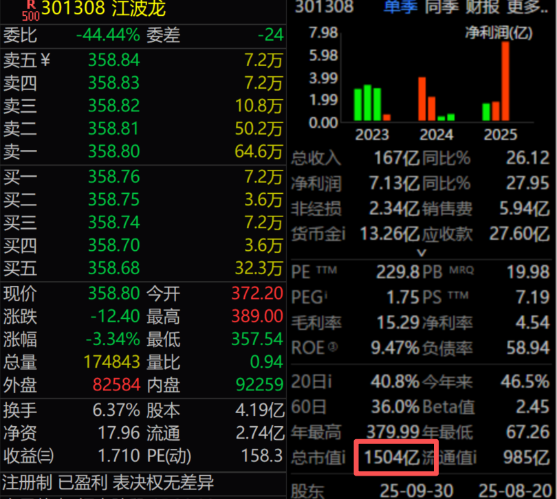截至1月29日收盘,江波龙股价为358.8元/股,总市值达到1504亿元。