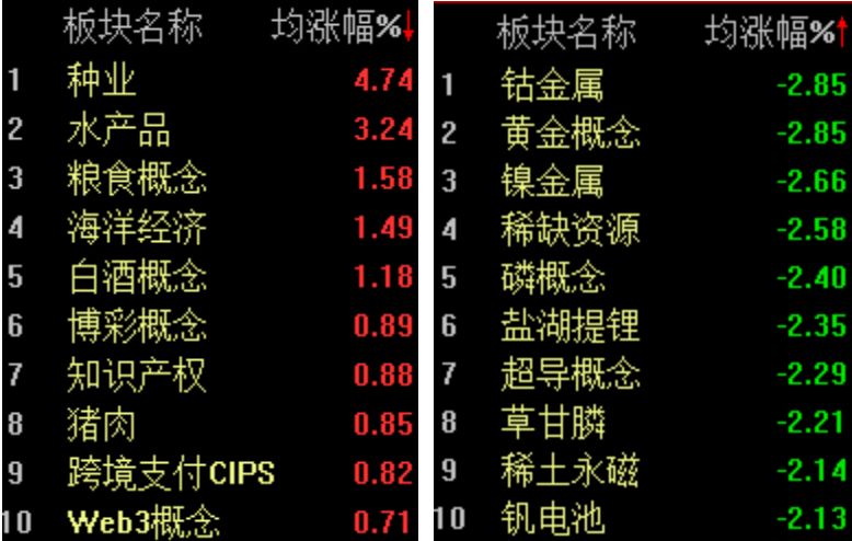 板块方面,渔业、水产概念、种植业、白酒等涨幅居前,贵金属、普钢、能源金属等板块则表现不佳。