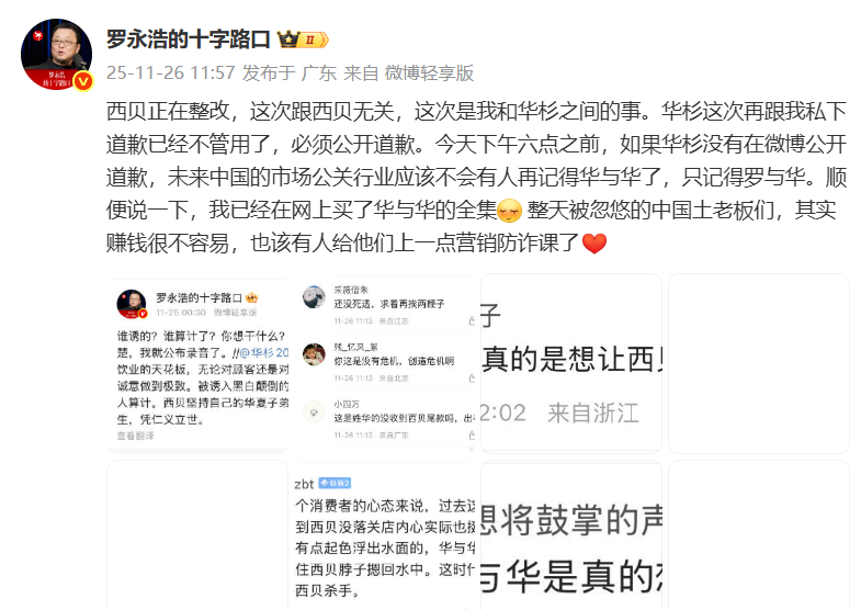 当天,罗永浩再发文称:“西贝正在整改,这次跟西贝无关,这次是我和华杉之间的事。华杉这次再跟我私下道歉已经不管用了,必须公开道歉。今天下午六点之前,如果华杉没有在微博公开道歉,未来中国的市场公关行业应该不会有人再记得华与华了,只记得罗与华。顺便说一下,我已经在网上买了华与华的全集。整天被忽悠的中国土老板们,其实赚钱很不容易,也该有人给他们上一点营销防诈课了。”