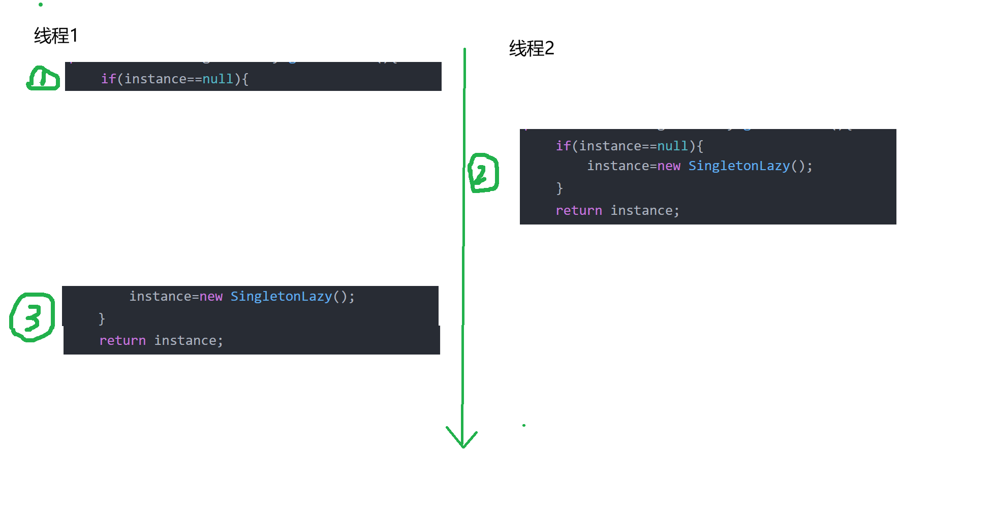 如果是这样执行的话,线程1和线程2的instance对象就会不一样,也就是有两份对象,不满足我们单例模式下·只创建一份对象的初衷!