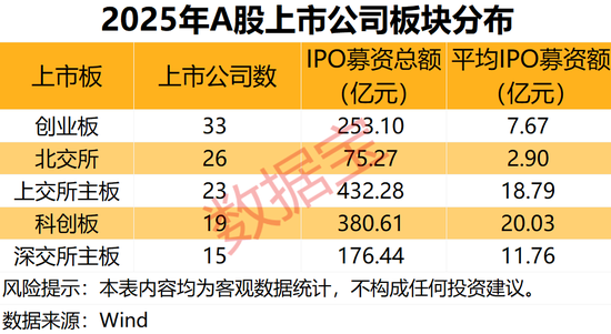 分板块观察,各上市板块IPO呈现出鲜明的差异化特征。创业板上市公司数量最为可观,共33家,占全部上市公司总数的28.45%。科创板块融资能力更强,单家公司平均IPO募资金额最高,为20.03亿元。北交所新股发行稳中有升,2025年共有26只新股发行,占全部A股的22.41%,下半年新股发行节奏提速,其中20只新股为下半年发行。