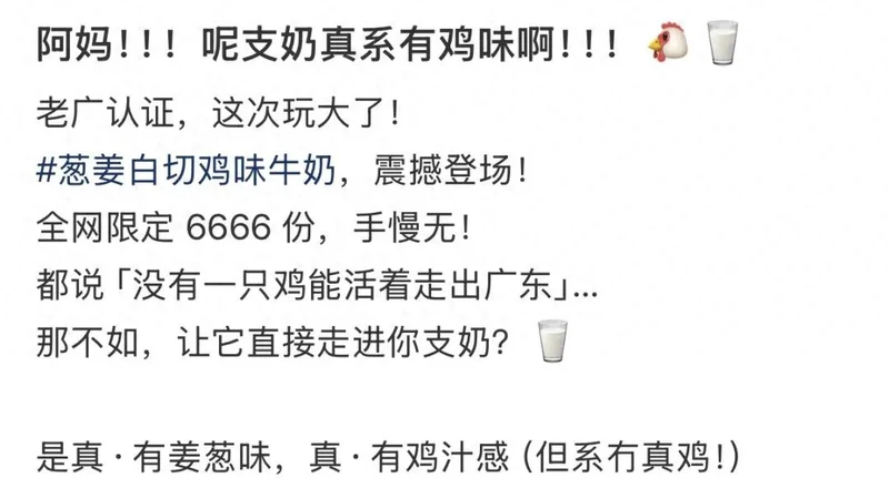 “没有一只鸡能活着走出广东”这句话的含金量还在上升最近你有听说过一款鸡味牛奶吗?