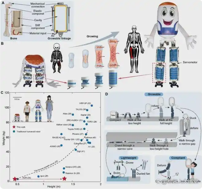 为了确保充放气过程中的稳定性,研究人员还独创性地设计了同步电缆约束机构——通过四根等长电缆确保两端始终平行。加入的线性导向杆进一步增强了抗弯曲能力,让机器人在站立时也能安全地变换高度。