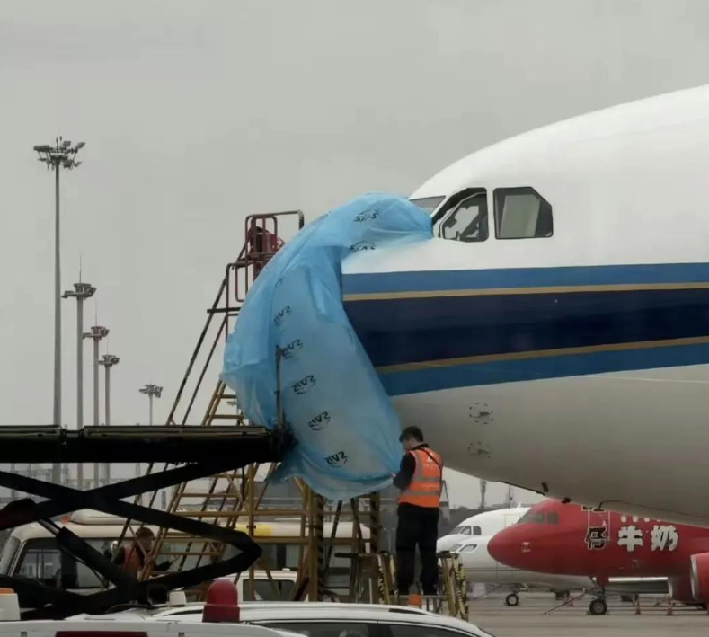 另有网友拍摄照片显示,飞机落地后,机务人员对裸露的雷达天线进行了塑料布包裹防护。