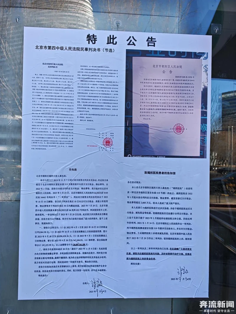 1月21日上午,奔流新闻记者来到北京市朝阳区望京东园519号的北京嫣然天使儿童医院。这栋四层楼的墙体上,北京嫣然天使儿童医院门口的标识已被拆除,取而代之的是法院判决书、强制执行公告和房东告知函。这些法律文书显示,医院需支付的拖欠租金及相关费用总计约2600万元。