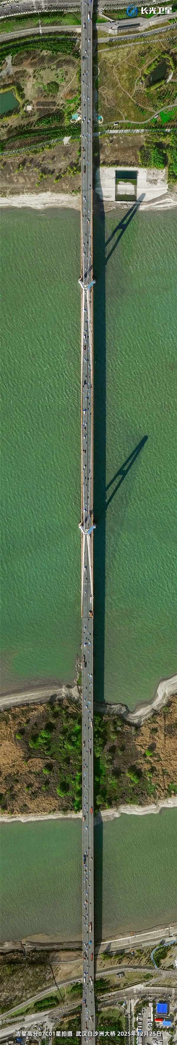 白沙洲大桥巨大的斜拉索在江面上投射出线条分明的平行阴影,与桥上川流不息的车流光影一同律动。
