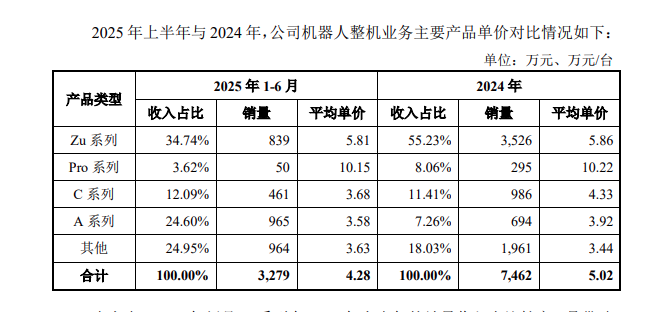 此外,该公司还披露了2025年上半年与2024年的机器人整机业务主要产品单价对比情况: