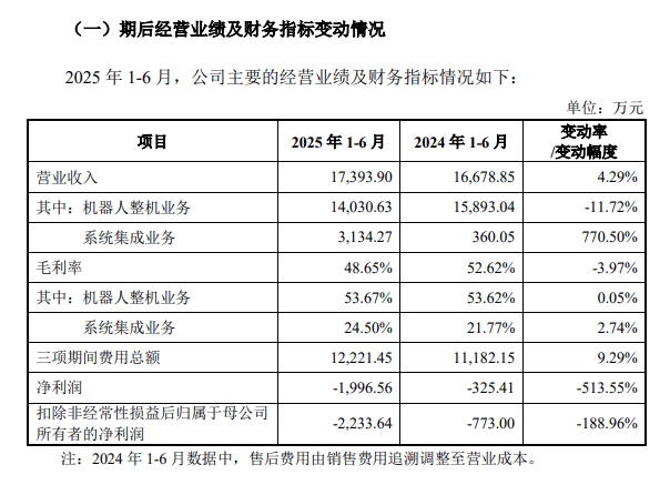 2025年上半年,节卡机器人营业收入为1.74亿元,同比增长4.29%;净利润为-1996.56万元,同比下滑513.55%;扣除非经常性损益后归属于母公司所有者的净利润为-2,233.64万元,同比下滑-188.96%。