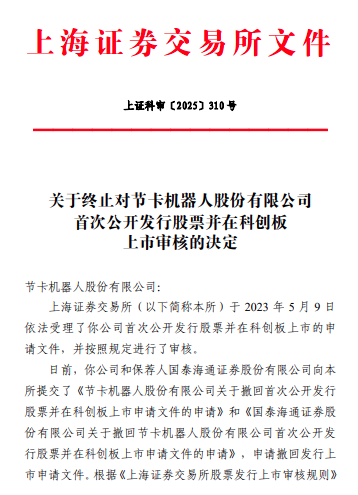 近日,上交所发布公告称,收到节卡机器人及其保荐人国泰海通申请撤回发行上市申请文件。根据有关规定,上交所决定终止对节卡机器人首次公开发行股票并在科创板上市的审核。