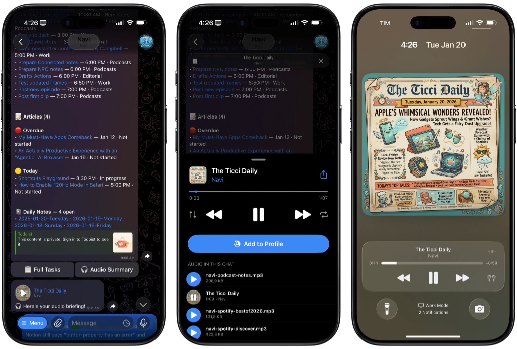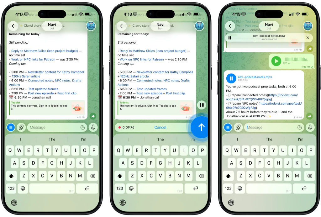 为了实现更自然的交互,Viticci进一步要求助理能够智能匹配回复方式:语音请求用语音回复,文字请求用文字回复。Clawdbot自主研究了ElevenLabs的最新TTS模型文档,请求了API凭证,并创建了三个不同个性的测试语音供选择。最终,Navi获得了语音回复能力,支持意大利语、英语或两种语言混合使用。