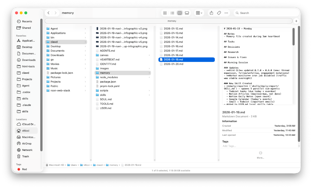 Clawdbot的记忆系统同样基于本地文件。它每天自动生成Markdown格式的日志来记录交互内容,这些文件可以直接导入Obsidian、通过Raycast搜索,或用Hazel进行自动化处理。