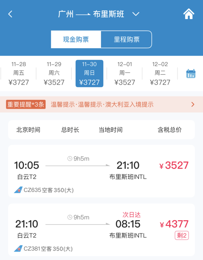 ✈️ 南航:广州⇌布里斯班增至每日两班