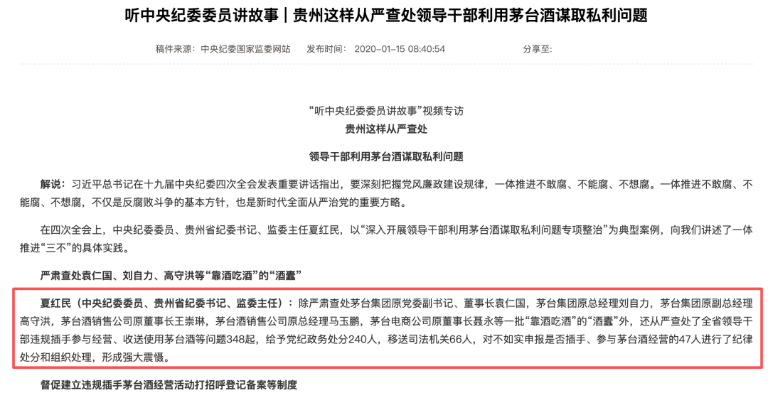 通报提到,除严肃查处茅台集团原党委副书记、董事长袁仁国,茅台集团原总经理刘自力,茅台集团原副总经理高守洪,茅台酒销售公司原董事长王崇琳,茅台酒销售公司原总经理马玉鹏,茅台电商公司原董事长聂永等一批“靠酒吃酒”的“酒蠹”外,还从严查处了全省领导干部违规插手参与经营、收送使用茅台酒等问题348起。