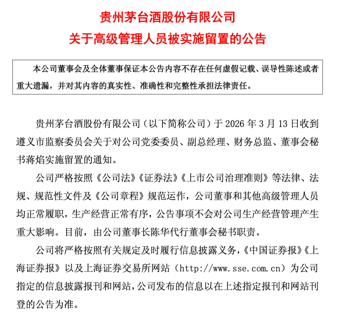 3月13日,公司收到遵义市监察委员会关于对公司党委委员、副总经理、财务总监、董事会秘书蒋焰实施留置的通知。