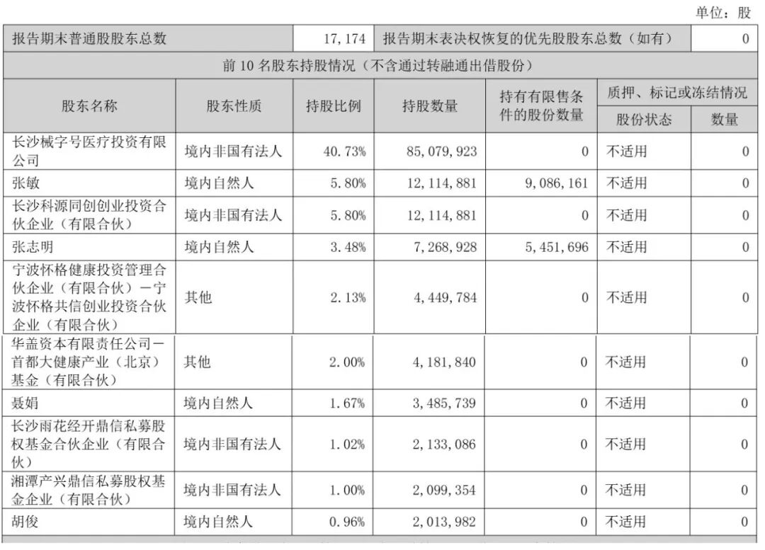 截至2025年9月30日,长沙械字号医疗投资有限公司持股为40.73%,张敏直接持股为5.8%,长沙科源同创创业投资合伙企业(有限合伙)持股为5.8%,张志明持股为3.48%,宁波怀格健康投资管理合伙企业(有限合伙)-宁波怀格共信创业投资合伙企业(有限合伙)持股2.13%;