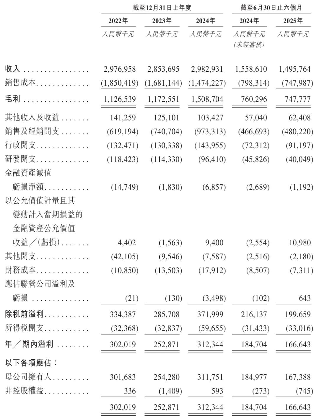 招股书显示,可孚医疗2022年、2023年、2024年营收分别为29.77亿元、28.54亿元、29.83亿元;毛利分别为11.27亿元、11.73亿元、15亿元;期内盈利分别为3亿元、2.53亿元、3.12亿元。