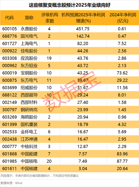 根据机构一致预测,有20只核聚变概念股2025年净利润有望实现增长(不含扭亏)。其中,机构一致预测永鼎股份和国光电气净利润有望翻倍,预测增幅分别为451.75%、142.74%;上海电气预测增幅超过80%;佳电股份、应流股份、东方钽业、宝钢股份预测增幅在40%以上。