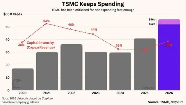 台积电周四表示,预计2026年营收将增长近30%,但资本支出将增长约32%,达到创纪录的520亿至560亿美元。该公司还表示,从长远来看,到2029年,未来五年营收平均增长率将达到25%,而人工智能业务同期平均增长率将达到55%或更高。这一数字高于此前40%左右的预测。