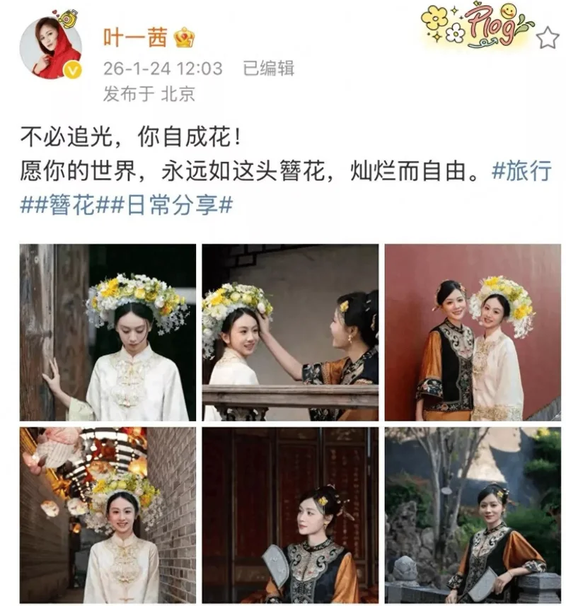 1月24日,叶一茜在社交平台分享了一组与女儿森蝶的合影,引来不少人的关注。照片中,母女俩都换上了带有浓郁中式韵味的服饰,还佩戴了精致的簪花,让整组画面多了几分温柔和雅致。